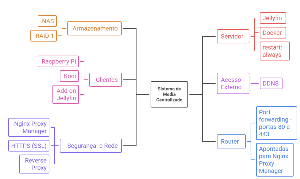 - Clientes: Dois (ou mais) Raspberry Pi a correr Kodi com o add-on Jellyfin, atuando como frontends independentes.
